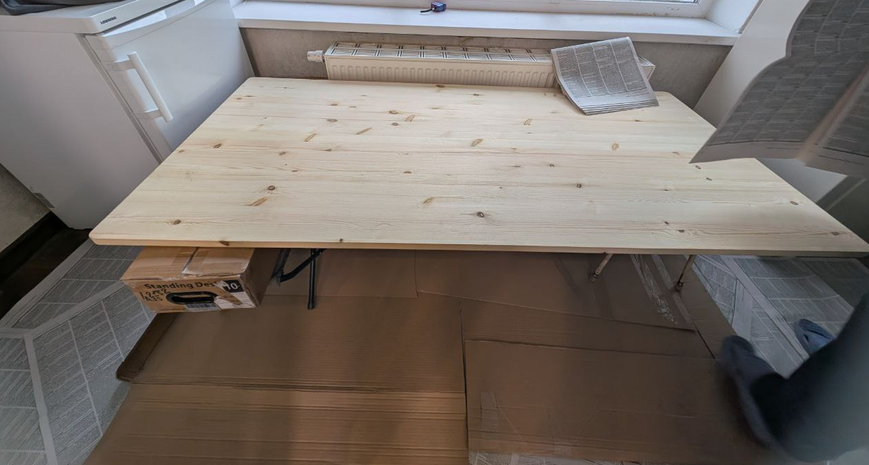 Друг, который помогал со сборкой, посоветовал ergostol. Взял бу механизм за 7 тыщ и столешницу за 4. Пришлось изучать обработку дерева: покраску и шлифование в 2–3 этапа.